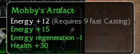 Mohby's Artifact, Energy +12, R9 Fast Casting, Energy +15, Energy regeneration -1, Health +30