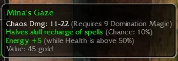Mina's Gaze, Chaos Dmg 11-22, R9 Dom, Halves skill recharge (Chance 10%), Energy +5 (While Health is above 50%)