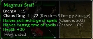 Magmus'Staff, Energy +15, Chaos Dmg 11-22, R9 Energy, Halves Skill recharge (Chance 20%), Halves Casting time (Chance 10%), Health +30
