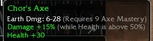 Chor's Axe Earth Dmg 6-28, R9 Axe, Damage +15% (whilst health is above 50%), Health +30
