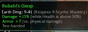 Bubah's Grasp, Earth Dmg 9-41, R9 Scythe, Damage +15% (While health is above 50%), Armor +7 (vs physical damage)