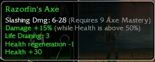 Razorfin's Axe, Slashing dmg 6-28, R9 Axe, Damage +15 (While Health is above 50%), Life Draining 3, Health Regen -1, Health +30
