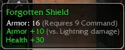Forgotten Shield, Armor 16, R9 Command, Armor +10 (vs Lightning Damage), Health +30