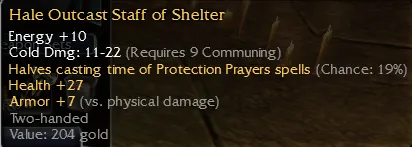 Hale Outcast Staff of Shelter, Energy +10, Cold Dmg 11-22, R9 Communing, Halves Casting time of Prayers spells (Chance 19%), Health +27, Armor +7 (vs Physical damage). Non-inscribable: c/o Cute - 5a