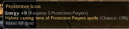 Protective Icon, Energy +9, R5 Prot, Halves Casting time of Prot Prayers (Chance 19%). Non-inscribable