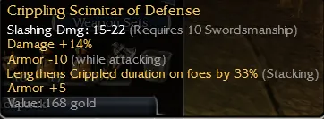 Crippling Scimitar of Defense, Dmg 15-22, Q10 Dmg +14% (Non Conditional) Amor -10 (While Attacking) Lengthens Cripple by 33%, Armor +5