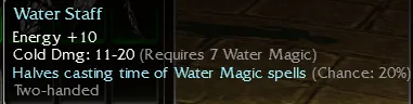 Confirmed pre nerf blue: Water Staff, Energy +10, Cold Dmg 11-20, R7 Water, Halves Casting time of Water spells (Chance 20%): c/o Cute - 50e