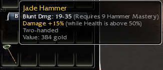 031Jade HammerHammerRareOSq9Hammer MasteryDamage +15% (While Health is above 50%)384
