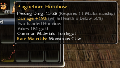 January 27, 2026 at 1:24 AM #1 Still getting back into the game and item pricing.Found this, can't find anything similar:Plagueborn Hornbow q11 damage +19% while health is below 50%Thanks
