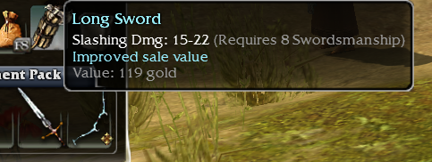 - Stats: Q8 Swordsmanship, 15-22 (Max), Improved Sale Value (Inherent)
