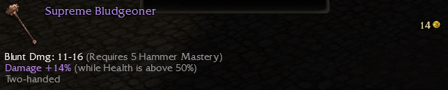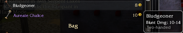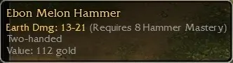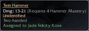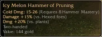 | Hammer | The Bludgeoner and Supreme Bludgeoner are probably the rare skins for this area, with Melon Hammer and Wolf Hammer being the more common drops, as well as the likes of Ball Hammer, Runic, etc... Although Amber could easily find the minimum of 4-6, anything above 8-10 just wouldn't drop unless it was with a requirement from a chest: If only it didn't have req 5, it would have been a new hammer stat for 0 requirement Hammers... And Jade just has to rub it in with her single run on this day... |