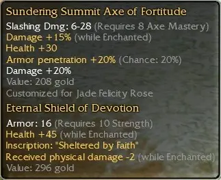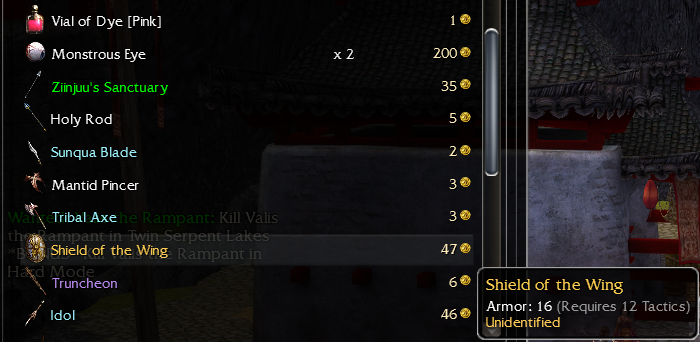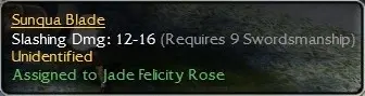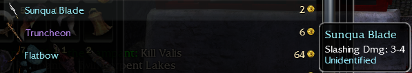 | Sword | Sunqua Blade found in Sunqua Vale sounds about right... They make up 99% of the sword drops and most tend to have a damage of 3-5. Didn't get any swords from chest drops either so could not get beyond single digit damages. Thought minimum damage of 3-4 was another impossibility until Jade almost merch this: |