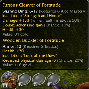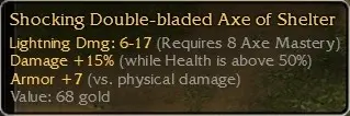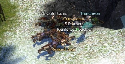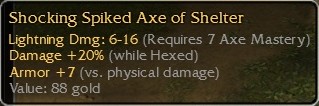 | Axe | The most common drops are Tribal Axe, Crude Axe, as well as the Rusty Axe ~ the minimum damage of 2-5 which was a drop from pre-searing Ascalon is difficult to beat, and my maximum was only 5-11. Most axes were within 3-5 or 3-6 range, but this dropped from a Sensali Fighter today ~ |