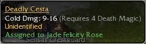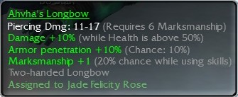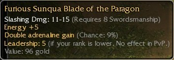 | Bow | The most common drops are Naga Shortbow, Naga Longbow, Wooden Flatbow, Feathered Flatbow, and the Shortbow (rare) ~ most drops come with a minimum damage of 4-6 so very common indeed, but Amber's maximum was only an 8-11 purple from a chest drop. I brought in my main account warrior Jade for a quick run in normal mode and she got an uncommon 8-12 Shortbow from a Shing Jea chest as well. Incredibly, most inherent mods on low damage bows (single digits) from chest drops were + dmg while hexed, but Amber's feathered flatbow drop from yesterday will be a keeper for pulls: Jade went one better today...