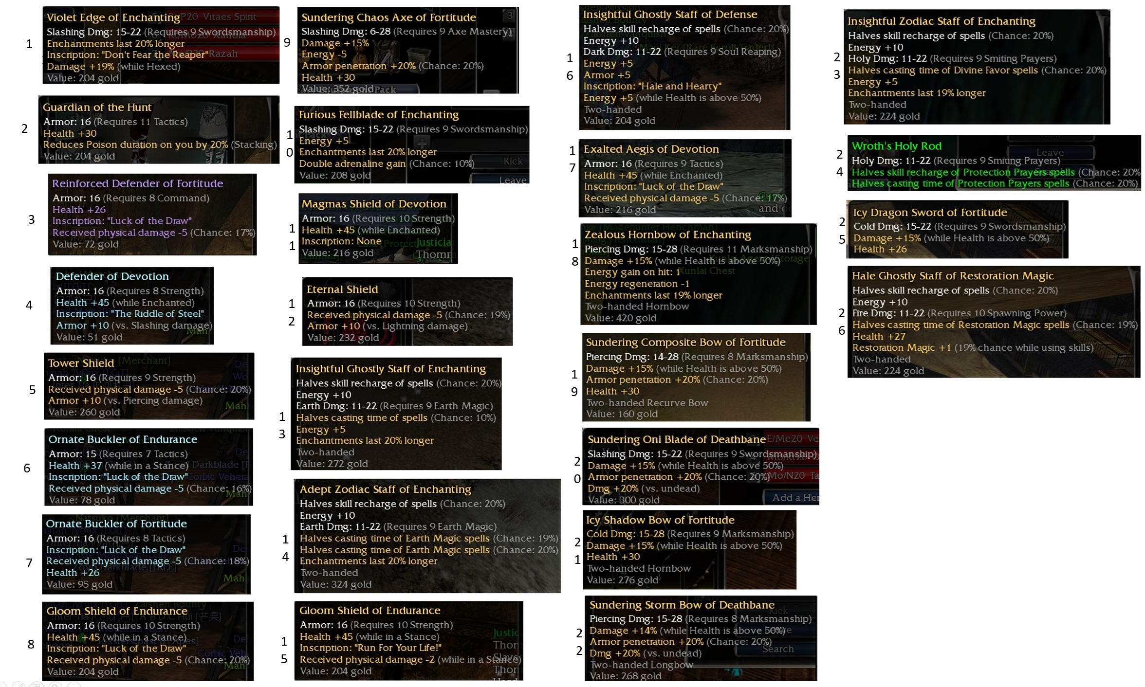 low req inscr. Shields 10-20e, maybe the purple more, check kamadan chat