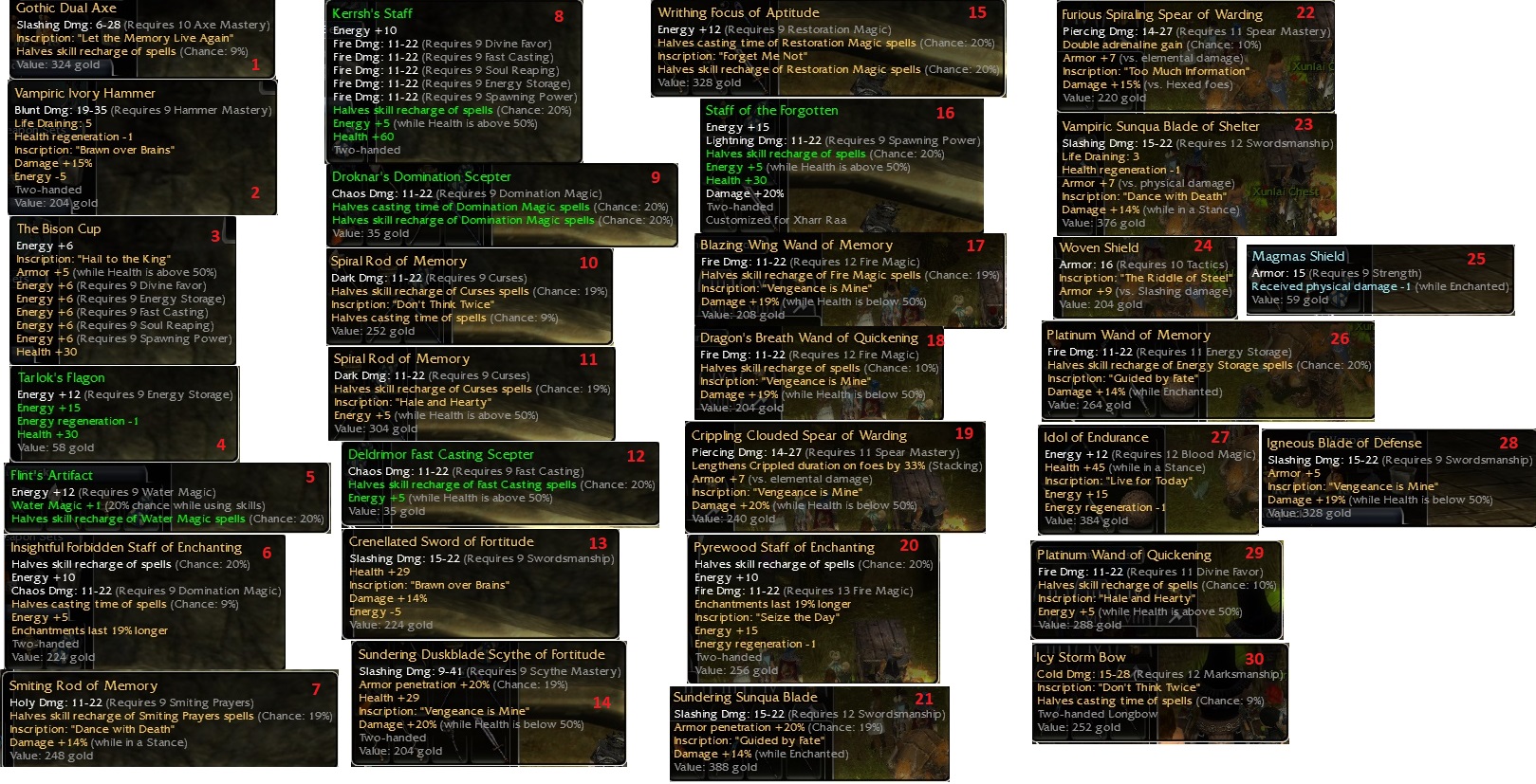 • Everything merch, or if you want to spend time in Kamadan 1-10e each.