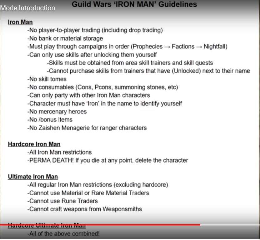 (this was like 3years ago)Extra challenge compared those rules i had was no gwwiki (i hadnt played missions in years so had forgotten everything basically) +did every side quest i found and mission masters before moving onto next areas !