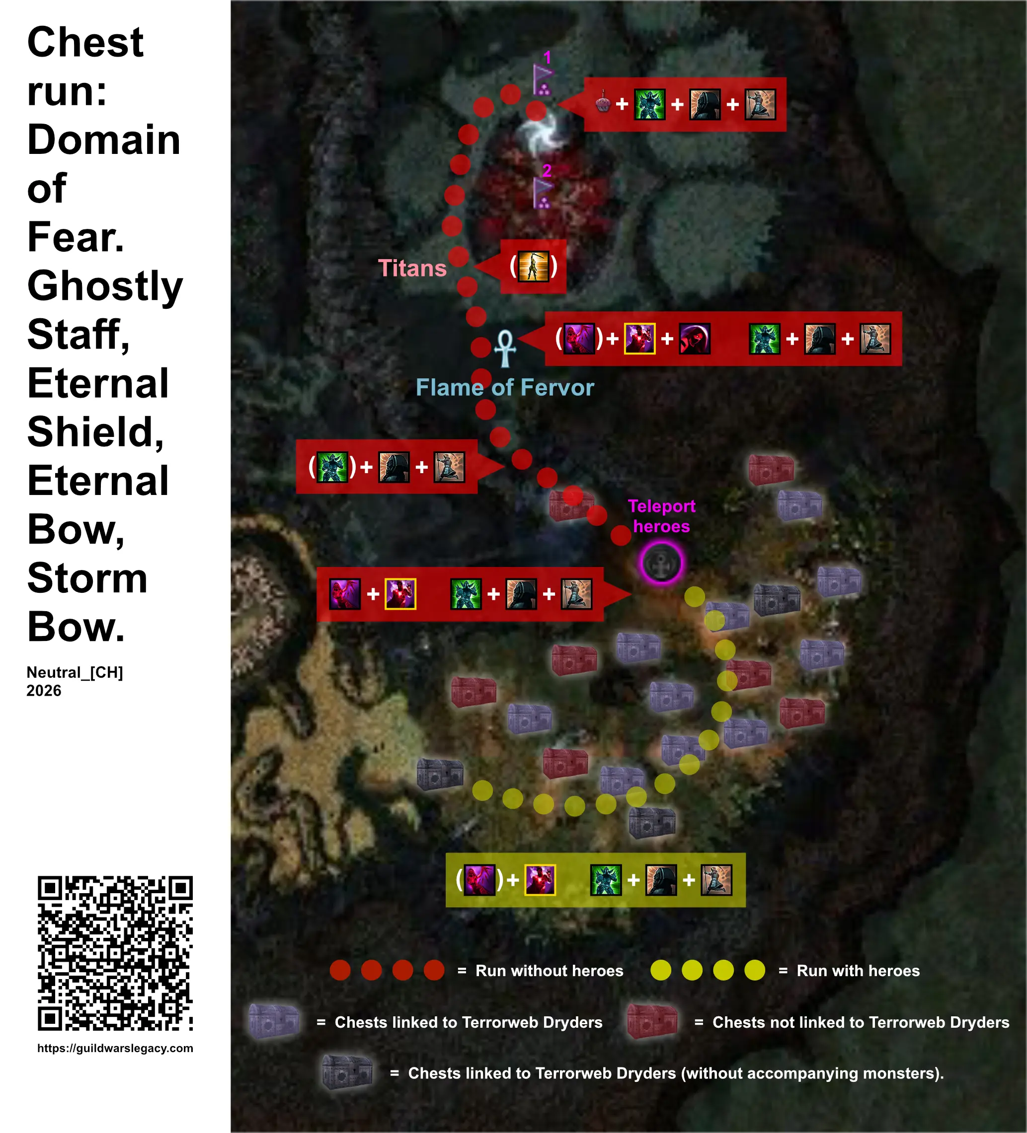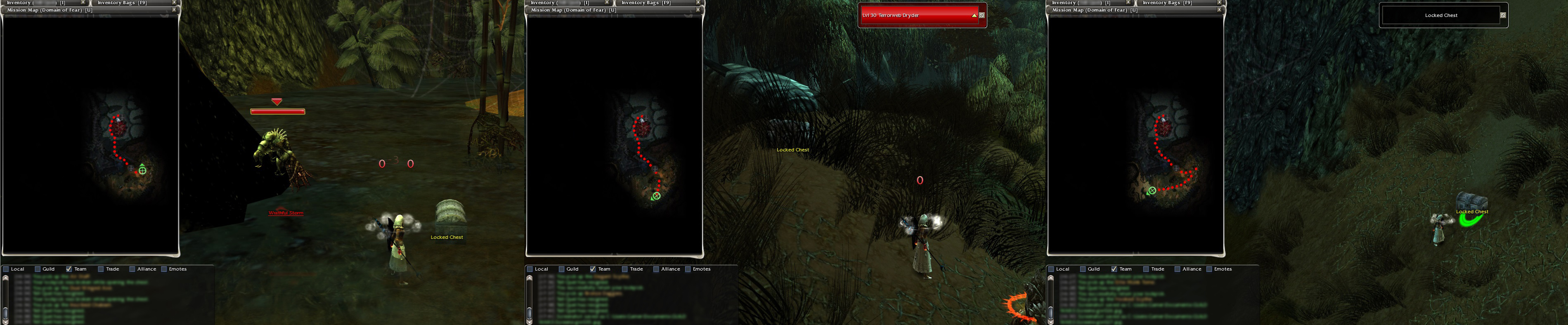 Note: Having already largely completed the titles: Treasure Hunter and Wisdom, I only open the chests associated with Terrorweb Dryders (see video and map). Depending on the situation, I use /resign towards the end of the run, west side, if certain chest appearances prevent the appearance of chests linked to Terrorweb Dryders (see map: red chests). Because the chests that appear during a run prevent those nearby from appearing as well. The video below shows a run practiced in this manner.