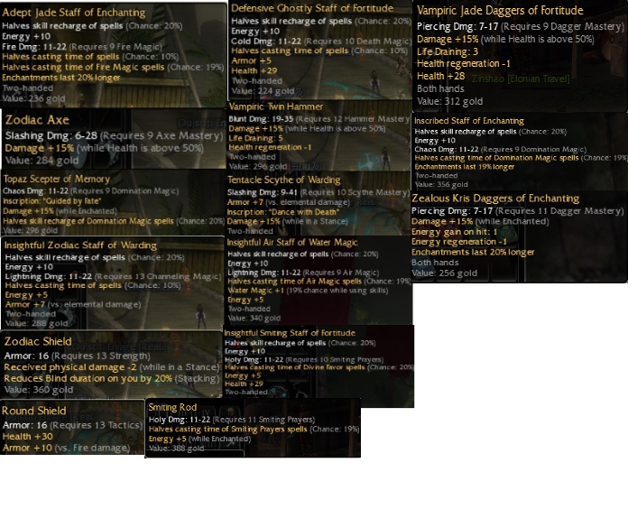 April 1, 2020 at 10:11 PM #2 Hey,Jade staff Q9 Fire: 5/10e (prob hard to sell, skin is common)Topaz scepter Q9 Dom: sold one like that few months ago for ~200e, quite rare and some people like it, but may have to b patient to sell itZodiac staff Q13 Chann: merchGhostly staff Q10 Death: Q10 kills it, maybe few ectos, Q9 20/10 are hard to sell and not worth much so Q10 is worseSmiting staff 10 Smite: merchJade daggers: 5/10e