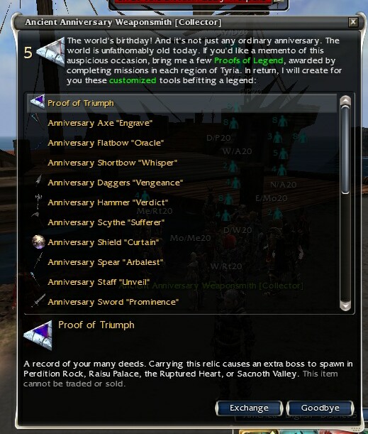 Additionally, at the Ancient Anniversary Weaponsmith, heroes can acquire a Proof of Triumph. Carrying this relic will cause an extra enemy group and boss to appear in four late-game maps—fight your way to them, and be sure to bring a Signet of Capture along to acquire a new PvE-only elite skill for each profession! If you miss this year’s celebration, don’t worry—the Proof of Triumph will continue to work when the festival ends so you can adventure with a friend to seek out the new skills.