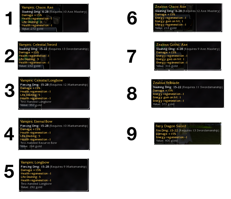 Chaos Axe is definetly worth much dont sell it fast, along with eternal Bow. Rest of the items should be in range of 25-50e. But best to Put on sale maybe some collectors will be interested, gl!