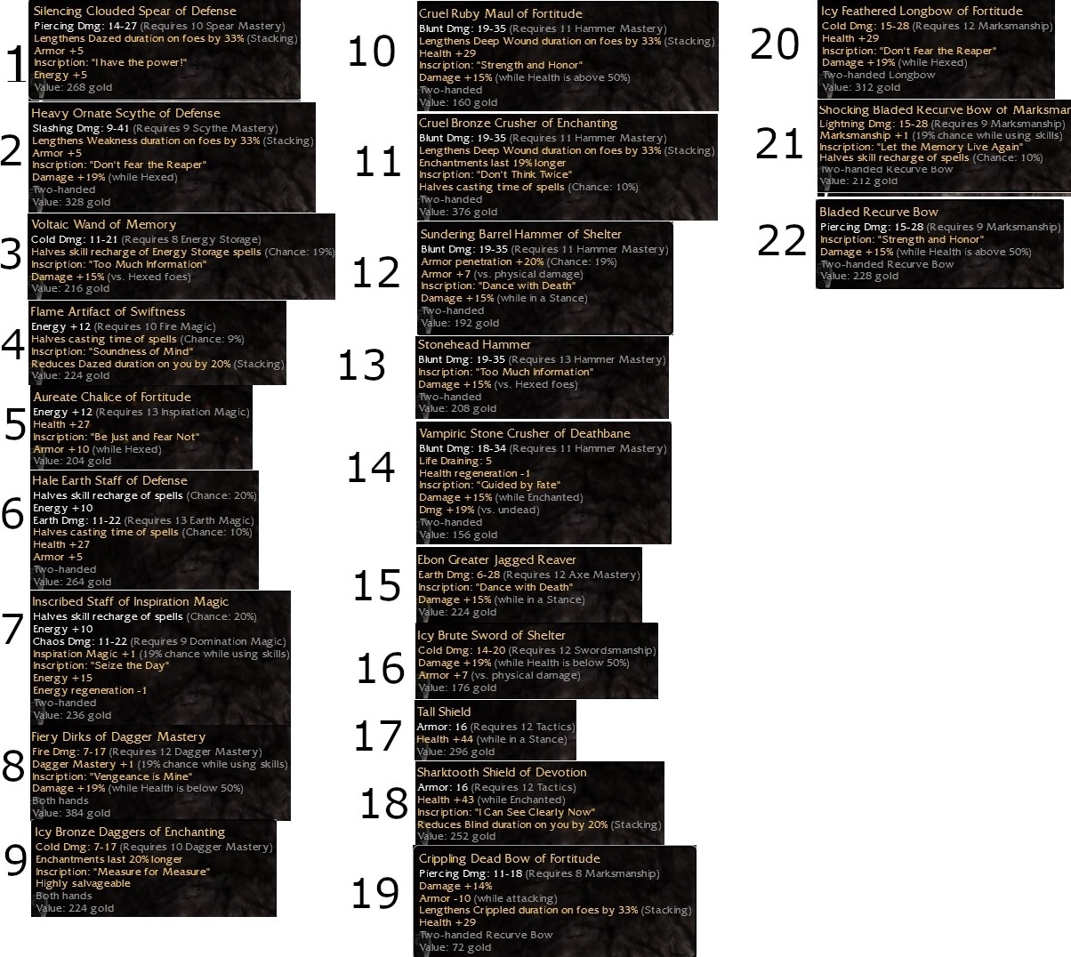 Hey, over the years I played GuildWars every now and then now I am back for some weeks. Over the past I accumulated some golden weapons and abandoned them in my chest. Now I want to clean my chest but I dont have a clue if I can just sell or savage my goldies.