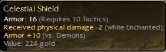 May 13, 2020 at 4:01 AM #1 Hi,Looking to get a PC on the following item, Q10 Tactics Celestial Shield +10vsDemons -2wE. Thanks!