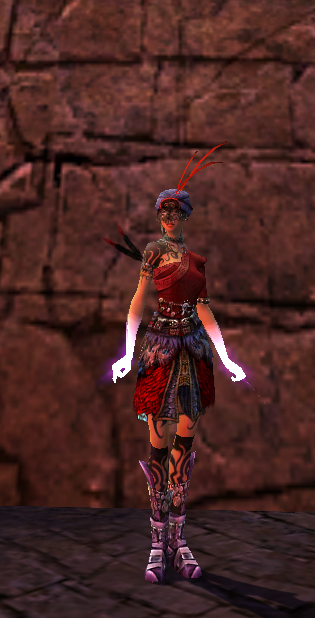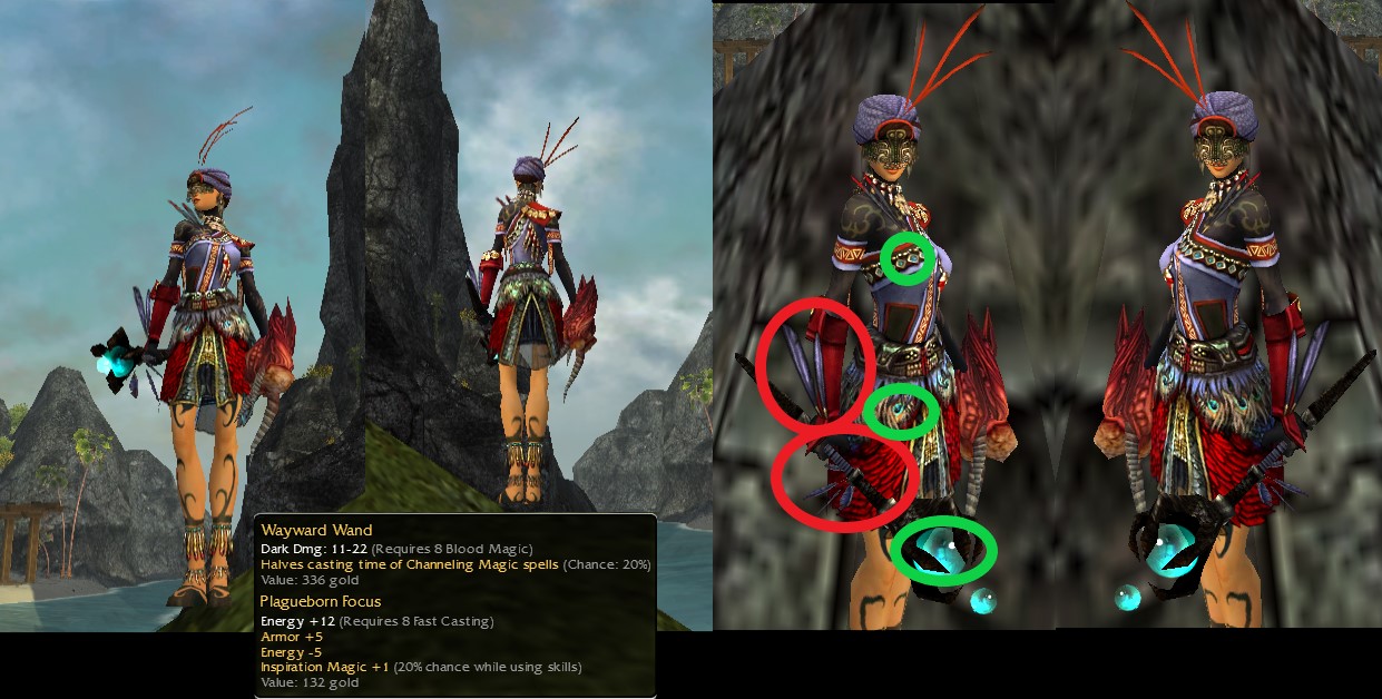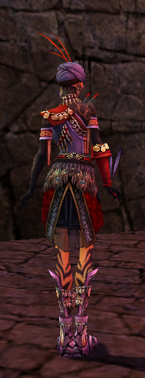 I like how the Feathers match from Wayward wand and the Armbraces(Red Circles) and the Wayward wand light blue is also found in the Peacock feathers of the Leg-Piece and the jewels from the Chest.
