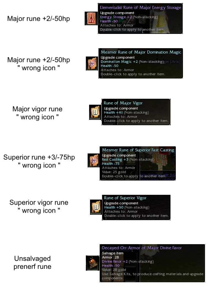 * Non-attribute rune with a "blue text" and/or "wrong icon". This include : Vigor, Purity, Clarity, Restoration and Recovery