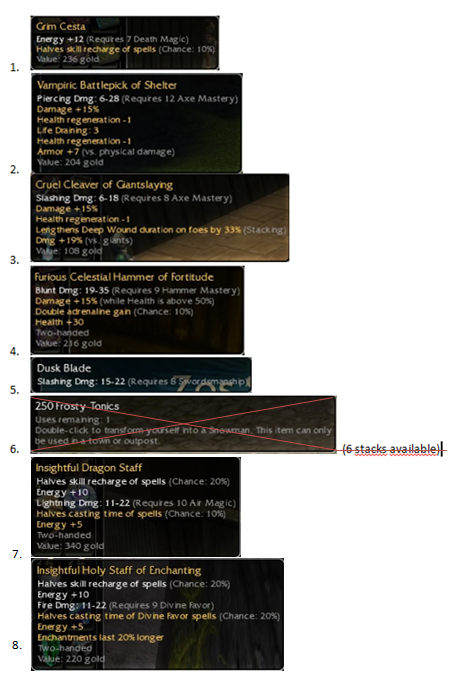 Dragon Staff & Holy Staff added, Frost Tonics sold (sorry, silvers, wouldn't have sold for 1e/stack…)