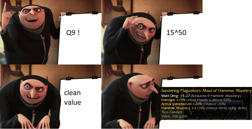TongTong nice meme :D only 100g item I look atm is a 100g clean value max mods and max armor for the req shield :angel: or if u find a plague shield I would also don't mind a matching 100g max dmg for req +5en sword to match it then 8o atm I got my q4 caster mammoth axe 100g I got giftet from a Friend that is waiting for an shield 🛡 :saint: