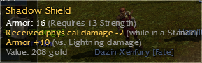 Req. 13 (Strength) OS Shadow Shield Dual Mod (-2wStance / +10vsLightning) = B/o 20E C/o 1 Lockpick Purely