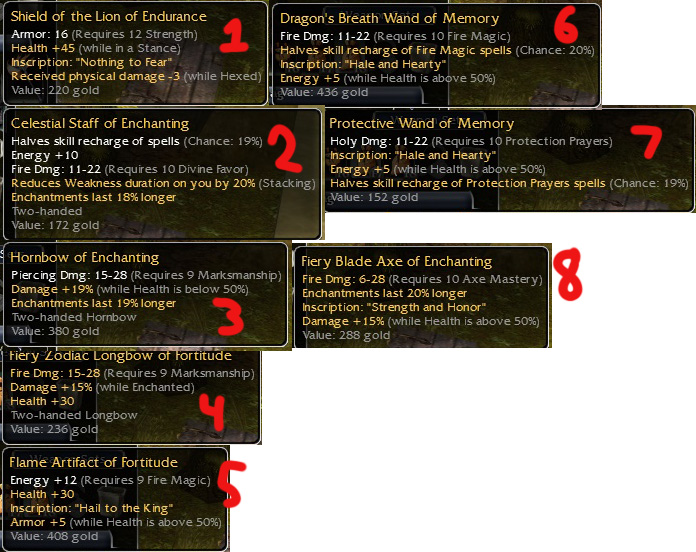 September 11, 2020 at 2:51 AM #1 Hi, I haven't played GW1 in along time came back and found these in my chest wanted to see if these were worth anything.Flame artifact is the Eye skin if that changes anything?Appreciate the help!