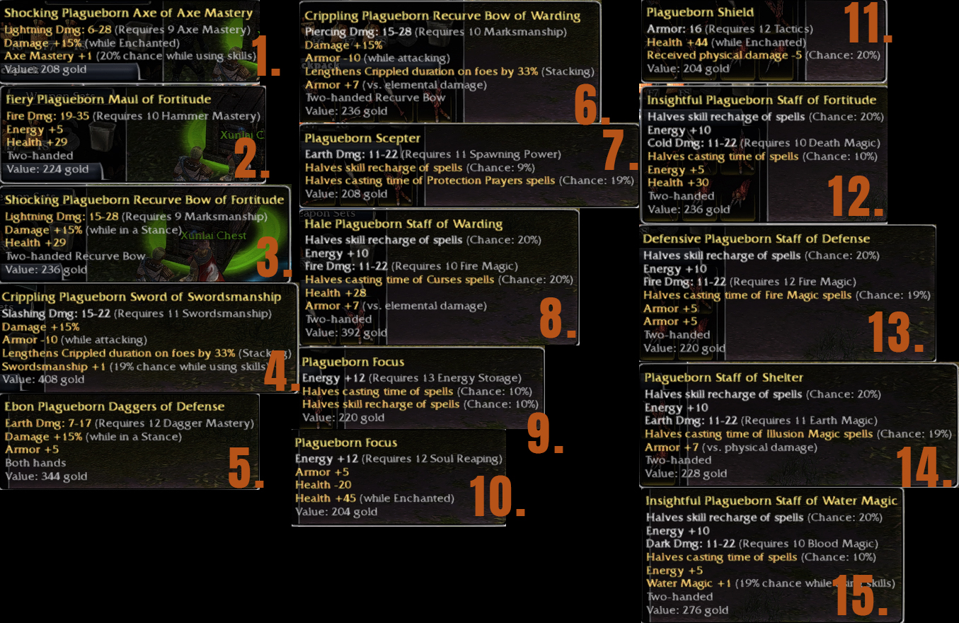 Updated all items, all are plagueborn currently.