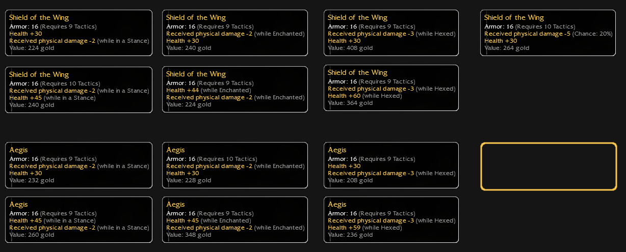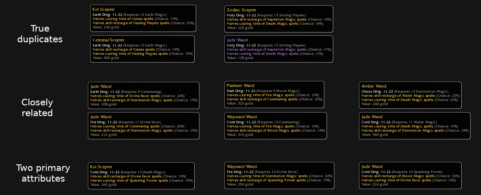 My all-time favorite weapon sets ! Matching req, matching HSR/HCT on 2 Mesmer’s attributes and they all have the same exact 208 gold value.