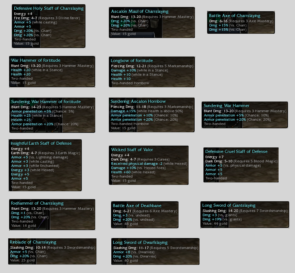 Unreplicable blue weapons from collectors, crafters and low level quests found in Prophecies. Is that even a collection if the items are so easily available ? Maybe not but I have 2 storage characters dedicated to them, so I might aswel include them !