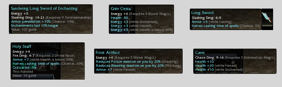 Part 2 : Some of the better known blue items, including the HoD sword, -50hp cesta, fake crysta, 10/10/10 cane and the anti-crit staff !