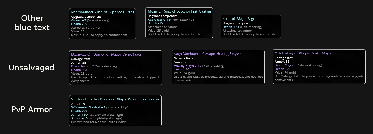 All the other : blue text, PvP, and my personal favorites : unsalvaged runes still in their original packaging !