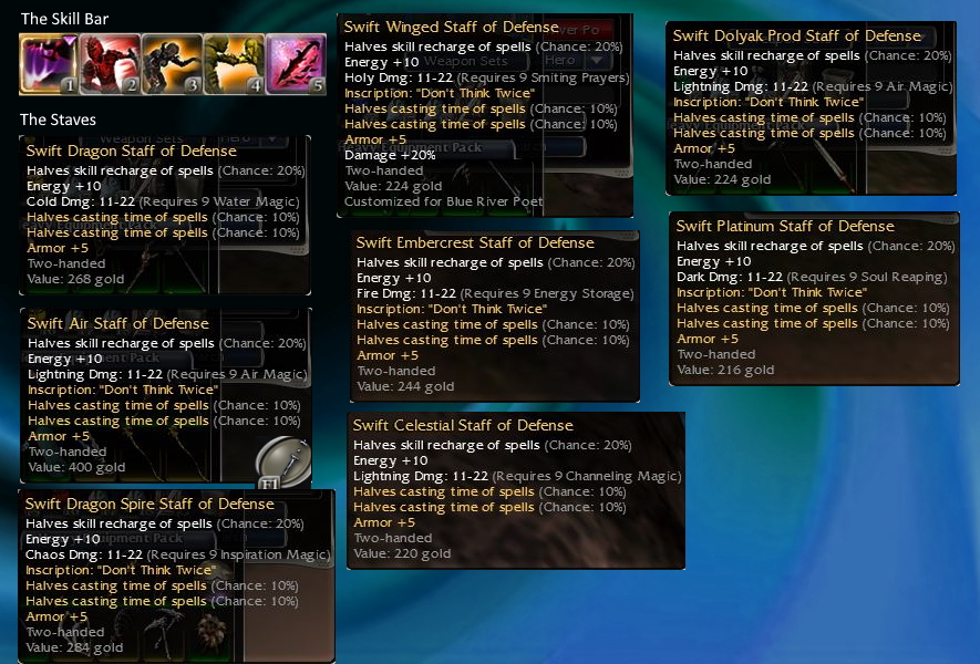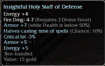 • The other day while I was farming Midshipman Morolah and Spafrod Iceblood to get the Morolah's Staff and Iceblood's Warstaff, I realized that since I started playing GW the unconscious assiduity (started in Nightfall with the inscriptions) was always using staves with +5 Energy (Inscriptions: "Hale and hearty" or "Have faith"), +30HP (Staff Head: Hale) and +45HP enchanted (Staff Wrapping: Devotion). Sometimes I changed my staff wrapping of "Devotion" for "Enchanting", so that the attunements would last me longer. Etcetera.