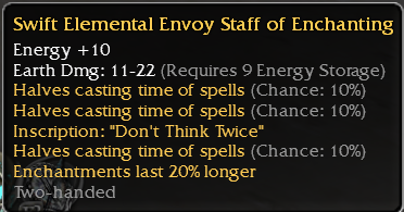 I say this because those green staves (Morolah and Iceblood) both have the same stats with an unique difference, one is +30HP and the other is "Enchantments last 20% longer", so I thought that the developers created those two staves with a clear intention regarding the 40% casting time, they are an attempt to work like a 40/40 set (but as a staff, obviously). Knowing that I don't need an Enchantments 20% longer if I'm not running/farming, and the extra HP is not a problem because we casters always attack from afar and the Heroes of our team can heal us quickly, what is the missing thing to finish perfecting a warstaff?