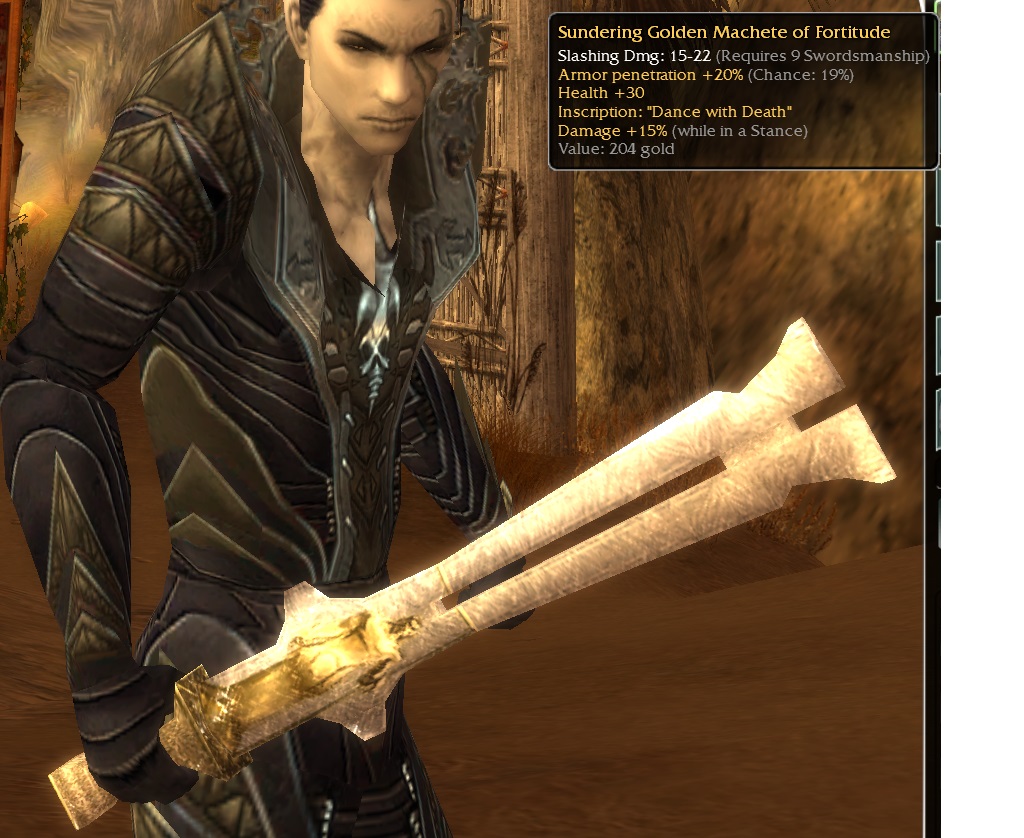 Sundering Golden Machete of Fortitude req 9 S Armor Penetration 19% Health +30 Inscrip Dmg +15% while in stance