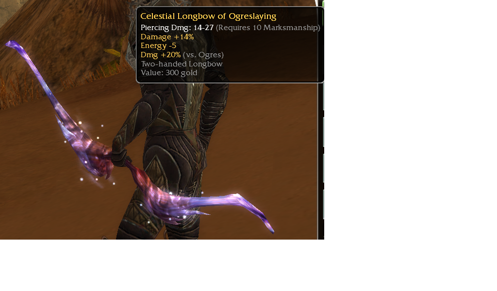 Celestial Longbow of Ogreslaying req 10 M Damage +14% Energy -5 Dmg +20% vs ogres