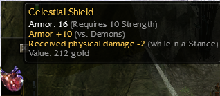 OS Celestial Shield q10 Str +10vDemons -2 phys while in Stance