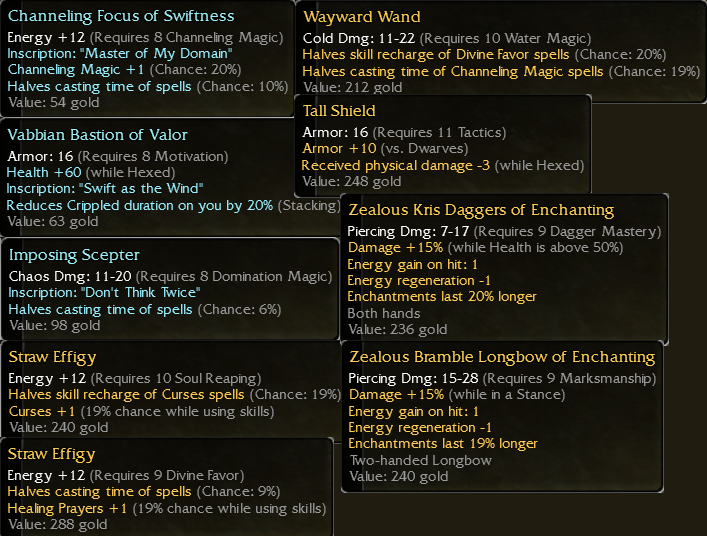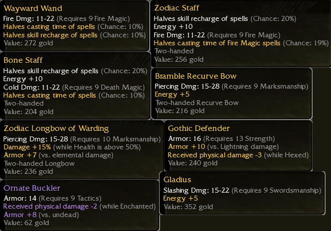 The only valueable items in my eyes are the zodaicscepter, axe and longbow. i would rate them at 30-50e max. Unfort, axe and longbow come in inscr mode so just real OS fans will buy them as the inscr. versions are much cheaper. The scepter has a bad mod combination but still i think there is somebody out there who is interested in this. Q10Str Exalted could also fetch some ectos but i dont think u will get more than 20e for that. it's one off and the mod combination is a bit meh!