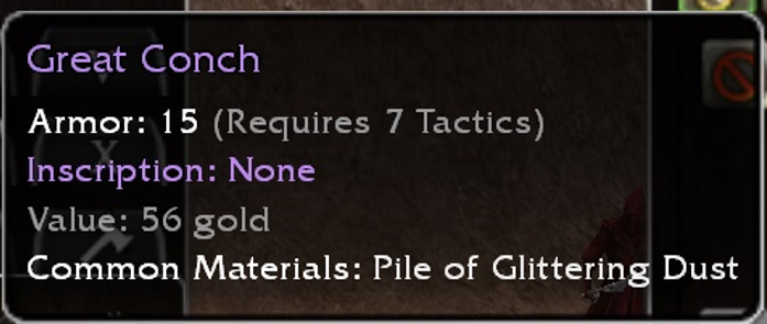 Purple Shield: Great Conch Armor:15 Req:7 Tactic Inscription: None // Reinforced Buckler Req9 Grischa February 23, 2026 at 10:49 PM BUMP