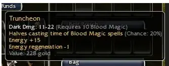 | Truncheon | 10 blood magic | hct 20% blood magic spells, energy +15 /-1 | ![]() |