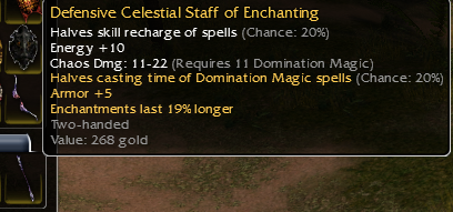 Item Code Item req (Attr) Mod Mod 2 (if Scepter) c/o Bidder OS-St-01 Earth Staff (core) 13 HCT 20% Earth -/- OS-ST-02 Forbidden Staff 9 (Curses) HCT 10% -/- OS-Sc-02 Plagueborn Scepter 9 (Divine Favor) +5e/ench HCT 10% OS-Sc-03 Plagueborn Scepter 11 (Illusion) +5e^50 HCT 20% Inspi Off-hand Items