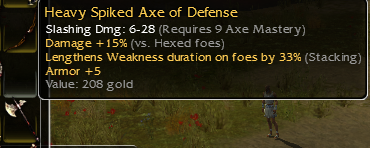 Item Code Item Name req (Attribute) Mod Stat 1 Stat 2 c/o Bidder Green-01 Maul of the Hierophant 9 (Hammer) 15^50 Furious 10% +30 hp Green-02 Pywatt's Talons 9 (Dagger) 15/ench Zealous 1/-1 Ench 20% Green-03 Falaharn's Split Chakrams 9 (Dagger) 15^50 Daze +33% +30 hp Green-06 Wilderm's Wand 9 (Illusion) +5e^50 HSR Illusion 20% -/- Green-08 Avarr's Scepter 9 (Death) HCT Death 20% HSR Death 20% -/- Green-09 Sourbeak's Taint 9 (Blood) Blood +1/20% +60 hp / hexed -/- Green-10 Reefclaw's Refuge 9 (Strength) Strength +1/20% +30 hp -/- Green-11 Koahm's Flatbow 9 (Marksmanship) +5e Crippling +33% +30 hp -