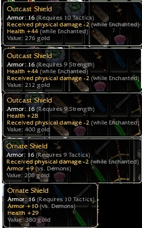 Ornate - q9 tactics, -2 while enchanted, +9 vs demonsOrnate - q10 tactics, +29hp, +10 vs demons