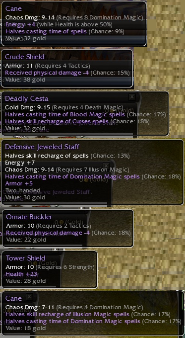 some mentions: Chaos Axe, Shadow Blade, Grinning Bow, purple Pre Items